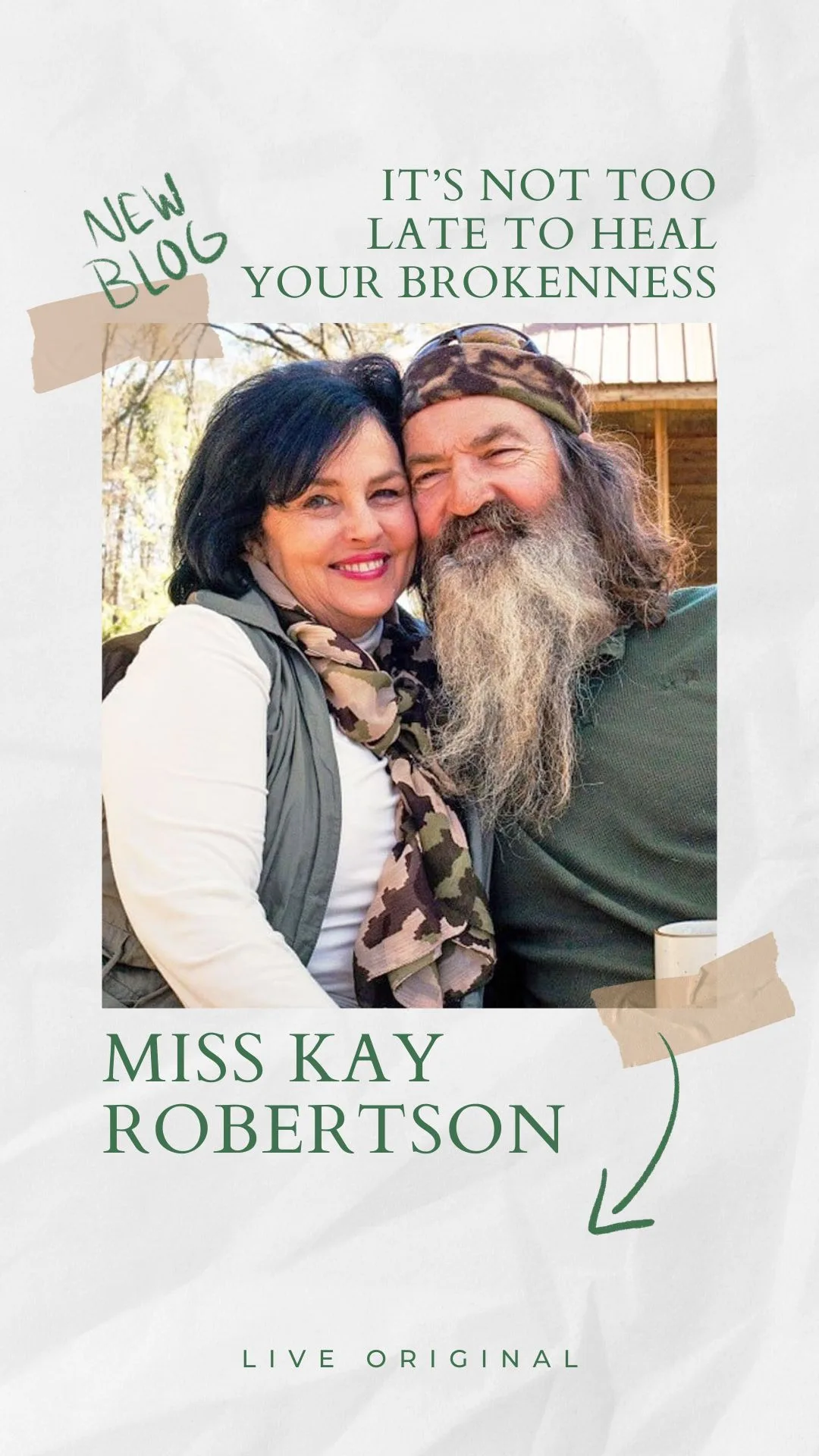 Miss Kay Robertson is the beloved backbone and funny bone of the Robertson family and star of the hit TV series “Duck Dynasty.” She married her pioneer man, Phil Robertson, and has four sons, one daughter, and more than 25 grandchildren and great-grandchildren. Kay is the New York Times best-selling author of several books and frequently appears on the “Duck Call Room” and “Unashamed” podcasts. She loves to cook for her family, feed her neighbors, and care for women in need.