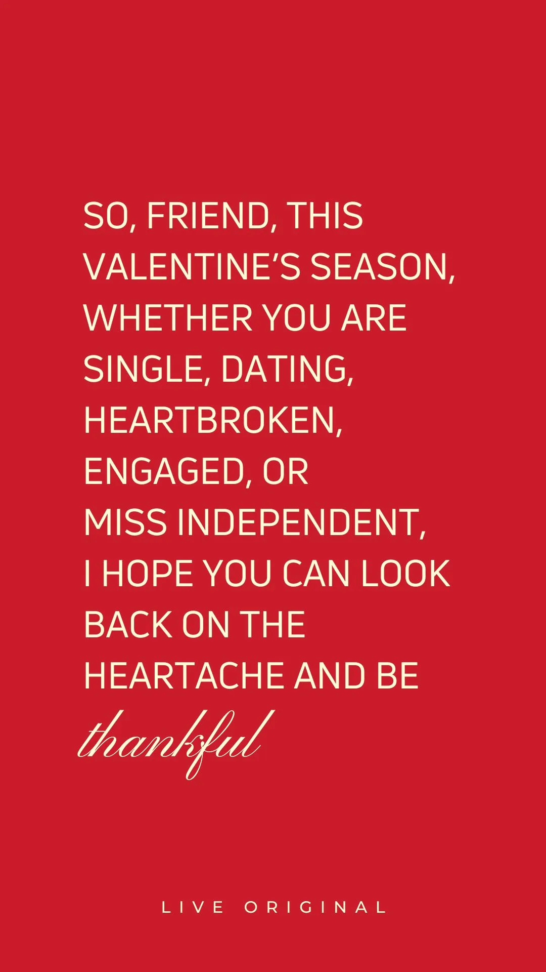 So, friend, this Valentine’s season, whether you are single, dating, heartbroken, engaged, or miss independent – I hope you can look back on the heartache and be thankful. Be thankful that the Lord allowed you to experience human failure so that you could better know His love for you. Be thankful it took a few failed relationships so that you could better recognize true love when it came into your life. Be thankful you have learned to guard your heart. Be thankful that you have gone through tough times so that way you can better relate and help others. Be thankful that each time you have gotten your heartbroken, the Lord has used that to redefine your definition of love to align with what it says in His word.